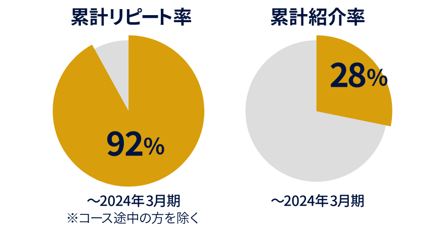 効果があるから継続する92%のリピート率、ご紹介率は28%、事情があってできないができれば継続したいと回答した方を含めると97%の満足度。