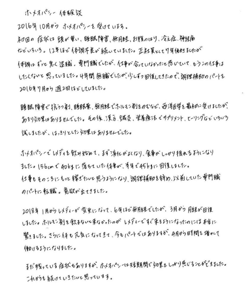 アッと驚くほどレメディーを飲んで変化があり、胸のくるしみなどはどんどんよくなり、40代後半ですが生理まで戻ってきました。